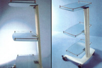 Kolica za aparate od plastificiranog metala, na zakocnim kotacima, s tri velike staklene police s inox-okvirom (ogradica). Ova kolica nude mnoge mogucosti za aparate pomocu Cosmoderm Stativ Mono kao glavnim modulom. Moze se nadopunjavati s mnogim detaljima, vidi Cosmoderm “Mono”